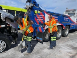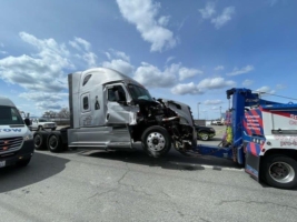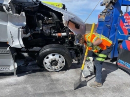 Once the spill recovery was underway, our Pro-Tow heavy-duty towing and recovery division removed the truck and trailer from the scene. First, we had to detach the tractor from the trailer. Then, we could load and haul each individually to a secure storage yard. From there, we completed the required paperwork, reconditioned our vehicles and equipment and called it a job well done.