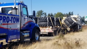 On Sept. 28, 2018, Team Pro-Enviro was called to help after a semi-truck carrying agricultural tires lost its load. The tires slipped off the semi-trailer on Northbound Interstate 5 in Kent, WA. Team Pro-Enviro responded quickly with a Century heavy-duty tow rotating boom truck to help with the load shift service.