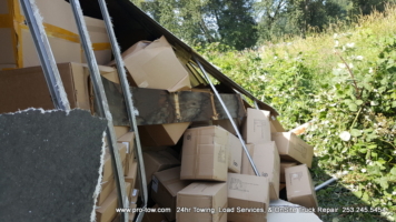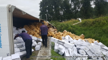 In this incident several years ago on July 1, 2016, a semi-truck tipped over and spilled its cargo at the edge of the road. Team Pro-Enviro responded with a cargo reload service, as spills don’t always involve fuel and oil! In this instance, product boxes needed to be cleaned up and reloaded.