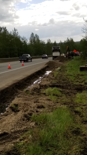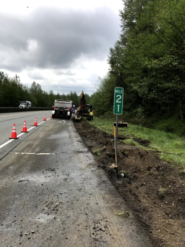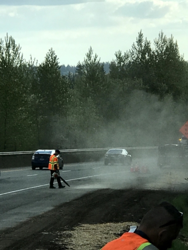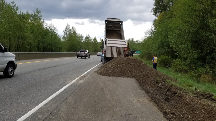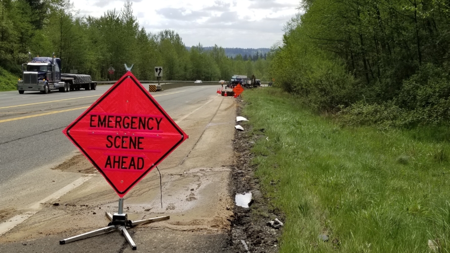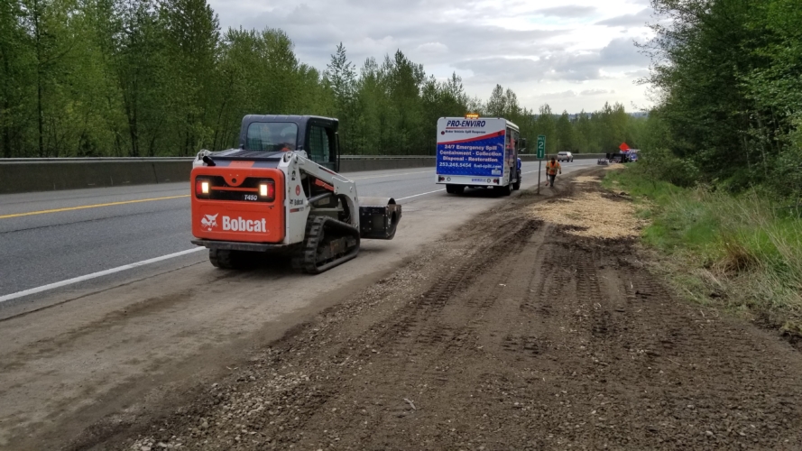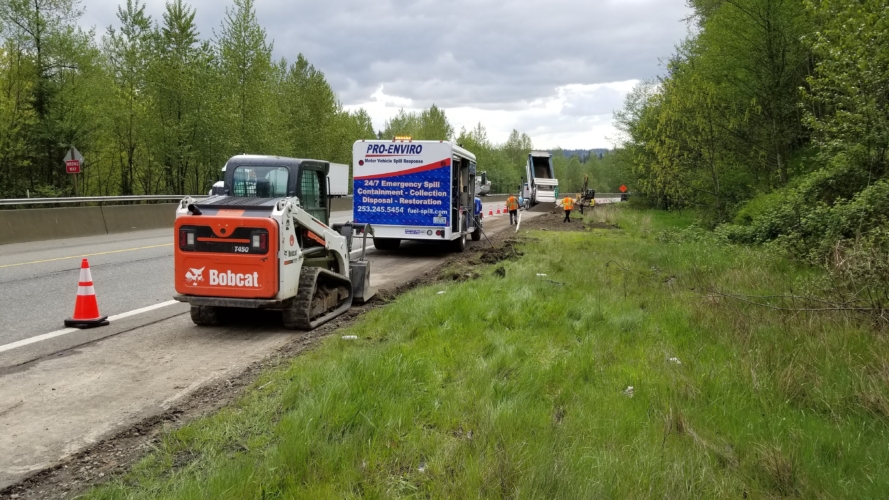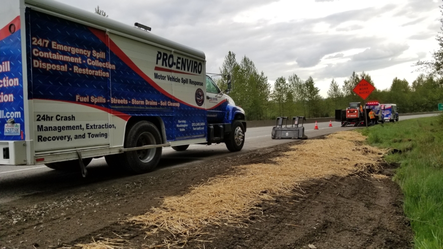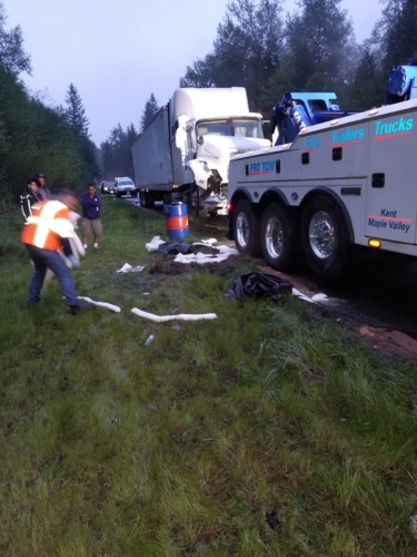 The semi-truck had been involved in a rear-end collision and was leaking vehicle fuel oil from its tank. Our Team Pro-Enviro dispatched an emergency motor vehicle spill response to help handle the containment and fuel spill cleanup. We arrived at the scene and reported to the incident command post, which involved the Washington State Police, Fire Department and Department of Transportation.