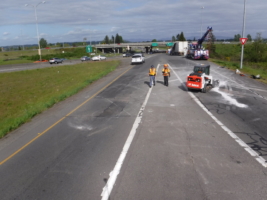 The truck had also spilled motor vehicle fluids and left a significant diesel fuel spill. Our team worked quickly to contain the spill and prevent runoff into a nearby storm drain. Once the casualty was recovered, we promptly contained and cleaned the area. Keeping hazardous fuel and oil away from the storm drain, and removing all contaminated soil and debris is part of a comprehensive spill recovery.