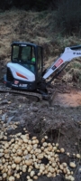 Not that it stopped our team, who began scooping up the potatoes with shovels. We also set up a platform to support the excavator and prevent spreading the contaminated soil while working on the cargo recovery. Once the team had set up, we used the excavator to collect the potatoes and dump them into grain sacks.