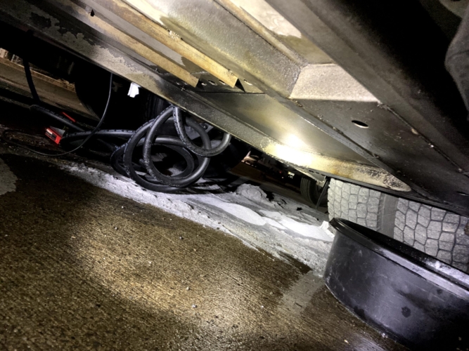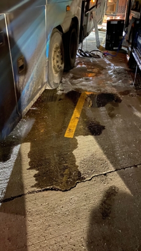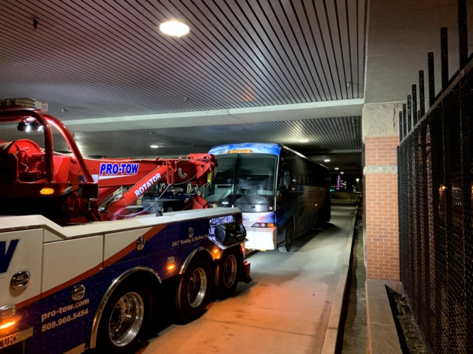 On February 10th, 2020 Pro Enviro was called to the scene of a parked bus at the Spokane Greyhound terminal that had a significant fuel leak. It required a spill cleanup. First, we had to deal with the bus. Once the leak was contained and no longer a hazard, our Pro-Tow 24 Hour Towing division hooked up the bus and removed it from the terminal.