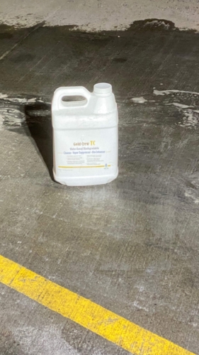 Once that was cleaned up, we gave it an extra scrub with Gold Crew TC formula. This product is water-based, biodegradable, and works well for spill cleanup of fuel and other vehicle operating fluids. It removes pollutants from the surface and reduces vapors, so it doesn’t wash away into stormwater and pollute waterways.