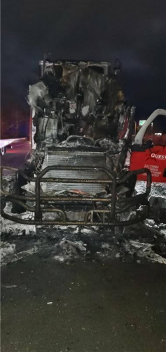 The first order of business was for Pro-Tow to hook up the burned tractor and trailer and lift it onto a flatbed for towing. Once this was done, it enabled our cleanup crew to get to work clearing and cleaning the roadway and surrounding area from the debris and contaminates.