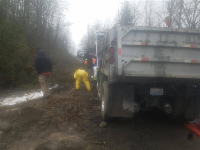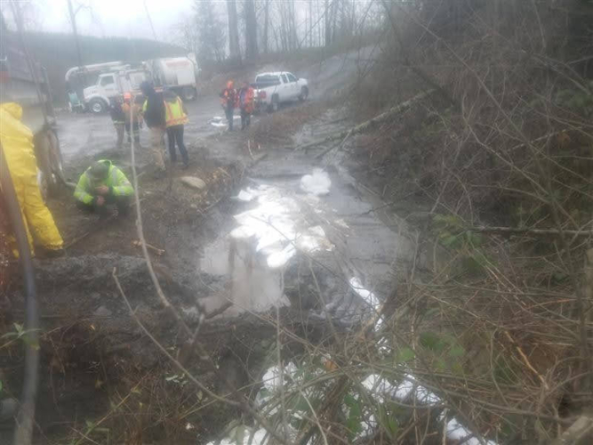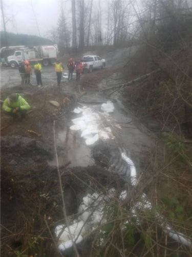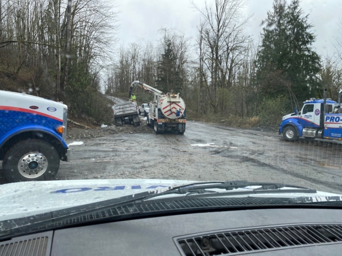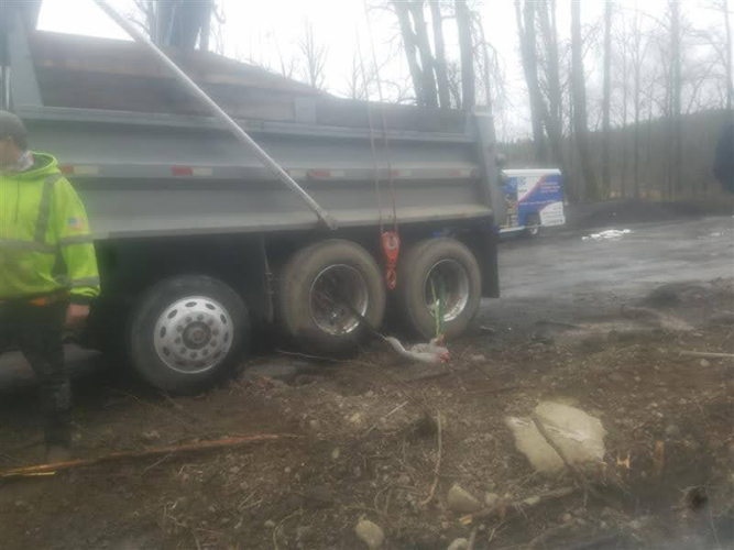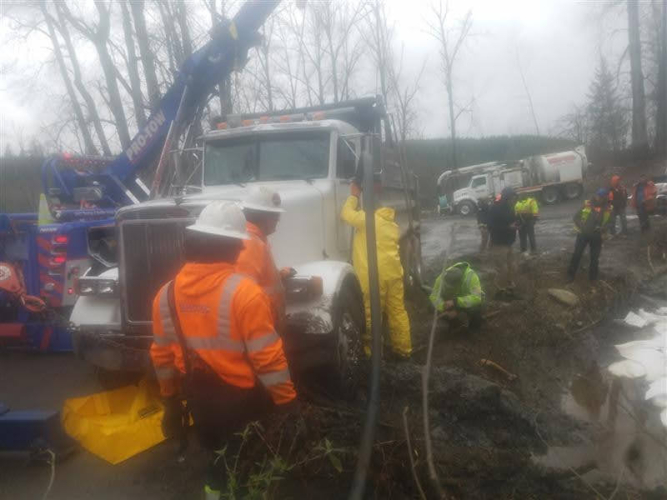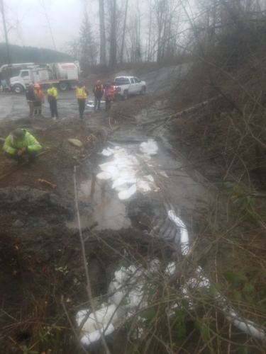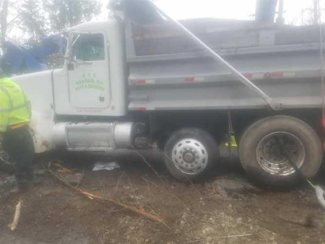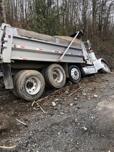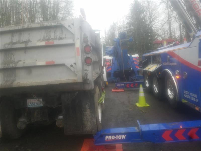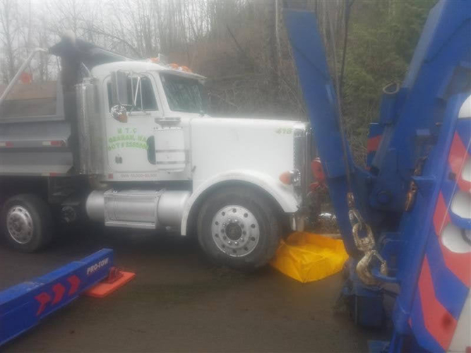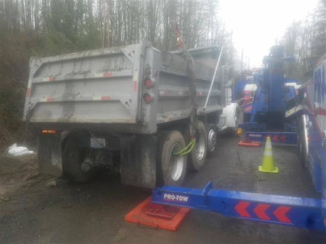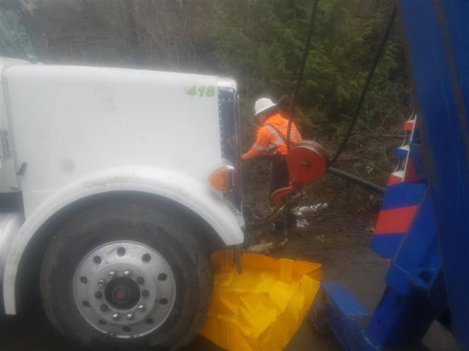 On March 6, 2020, Pro-Tow received a dispatch for truck accident recovery in Ravensdale. A dump truck had gone off the road and was in the ditch, needing heavy-duty towing. We went out to attempt a straight and forced winch extraction as per the customer’s request. However, when we arrived at the scene, we found an estimated 50 gallons of fuel and oil spilled because of the accident. Unfortunately, there was significant groundwater contamination that needed to be cleaned up too.