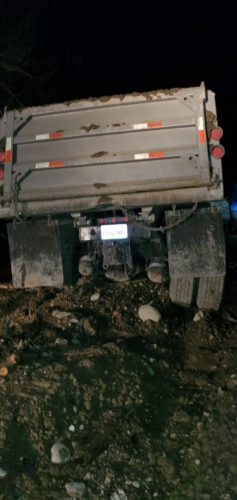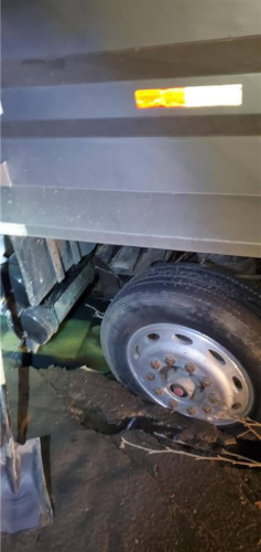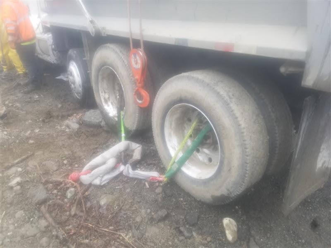 Once we could safely return the dump truck to the roadway, we discovered that it was still dripping fuel oil. We used containment berms to contain that extenuating fuel contamination. For both legal and safety reasons, our team had to perform a repair on the leaky fuel tank to prevent further leaking during transportation. Thankfully, we were able to hook up the dump truck and safely tow it to our secured storage yard. Because the tank was still leaking, it went into a portable parking stall with a containment berm.