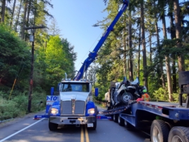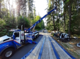 In this incident, on July 28, 2020, a loaded commercial truck and trailer ended up in a major incident. The trailer left the roadway, hit a tree, and collapsed utility poles onto it. Team Pro-Enviro and Pro-Tow responded to an emergency dispatch from the King County Sheriff’s office.