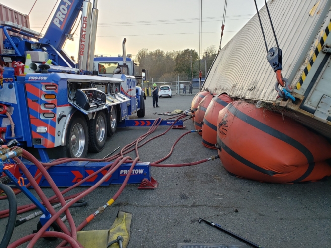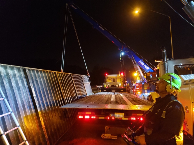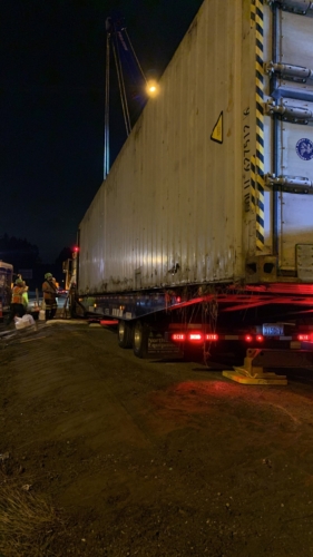 After Pro-Tow did an overhead crane lift to load the trailer onto the Landoll, a new problem sprung up. The container’s refrigerant fuel tank began to steam profusely. It was clear this was a serious and immediate safety emergency. We brought over all recovery personnel to help with safety containment and spill recovery measures.