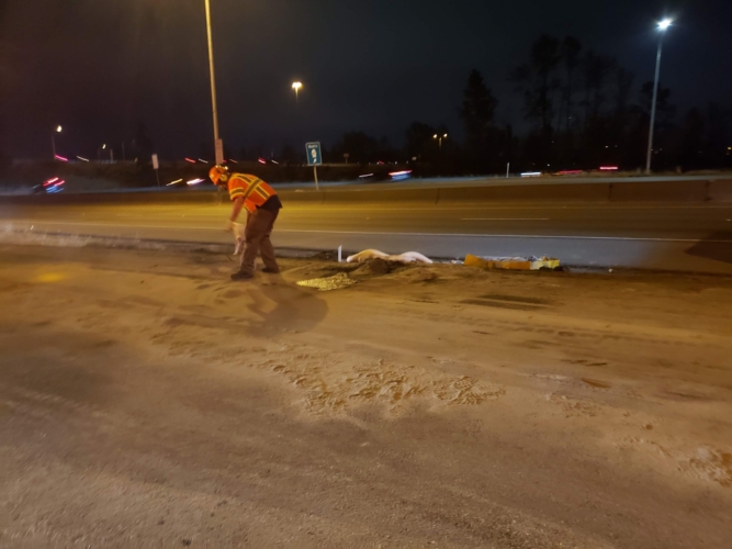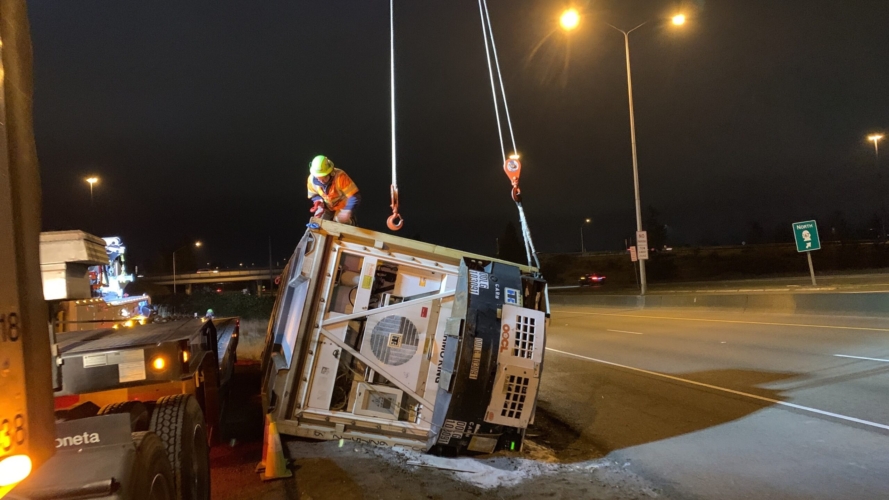 In this incident, on November 28, 2020, Our team received an emergency call for an overturned tractor-trailer on the onramp to WB SR18. The call came with a request for two heavy-duty recovery wreckers. Once we arrived, we found spill recovery was needed for the motor vehicle fluid leaking onto the roadway. It was also pooling under the nearby container. After we got written authorization from the owner to continue, Team Pro-Enviro worked quickly to tackle this issue.