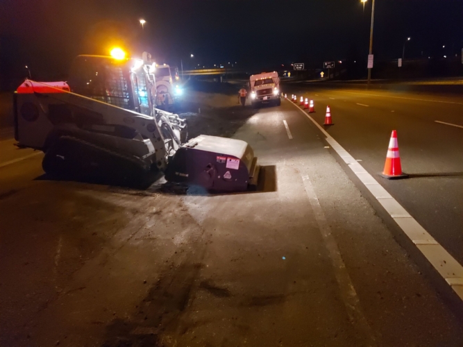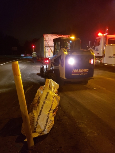 Additional equipment was necessary for the spill cleanup, so we requested a motor vehicle spill response team with the required special equipment. Handling this spill recovery included a spill response vehicle, flatbed tow truck, dump trailer, compact track loader, and specialized attachments.