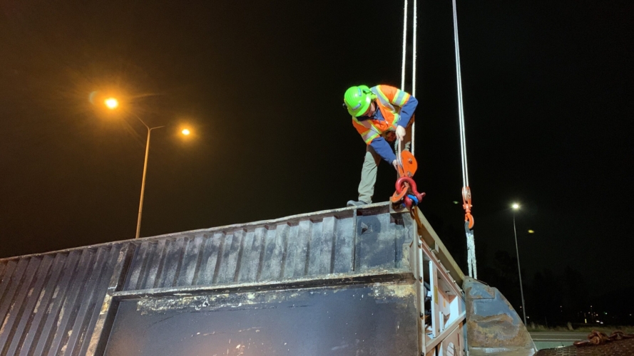 The leak’s location made it more difficult than usual to stop. This challenge led to a significant standby as our team worked to contain the leak. Still, we worked quickly and efficiently, using emergency spill control techniques until we stopped the leak again. With things safe once again, the suspended trailer could be loaded––finally.