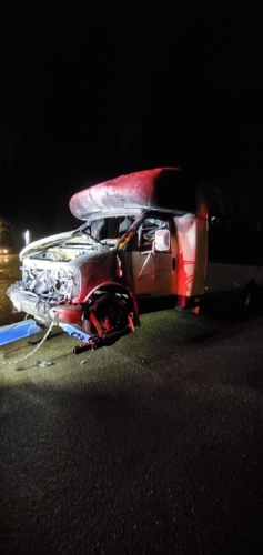 Upon arrival, we found the front tires had sustained too much damage from the fire for towing. We had to move it to perform proper spill clean up. That meant we couldn’t tow the truck from the front in the usual manner, so a different approach was needed. To properly tow the bus instead, we had to perform a double pick up. Once we put the straps into place, we moved the casualty away from the left lane’s remaining debris.