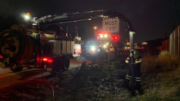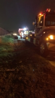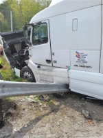 We arrived at the scene and evaluated the scene to find that the tractor was rammed into a concrete barrier. We found that engine oil pan was damaged and spilled 10 to 15 gallons of engine oil on the surface. Unfortunately, the casualty was precariously resting against the damaged guard rail with a fuel tank penetration. So that was a potentially big problem that required special care.