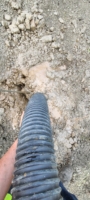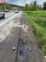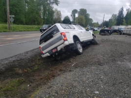 In April 2021, we were tasked with recovering a Ford F-250 pickup stuck in a Cedar Grove ditch. Once on the scene, it was discovered that the left front tire of the truck had been ripped off and that there had been a fuel spill. The removed tire revealed a large leak into the ground while the truck sat idle.