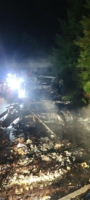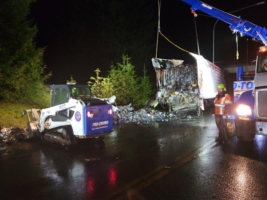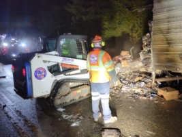 We gathered the necessary equipment, including a bobcat, and headed for the scene. Once there, we did a scene assessment before working on the trailer fire cleanup.