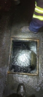 Next, our team cleared the melted ice cream mess and moved on to a nearby storm drain that also needed cleaning. Unfortunately, some debris and melted ice cream seeped in and needed remediating quickly. While our team worked on the storm drain and trailer fire cleanup, Team Pro-Tow rigged up the burned truck and trailer and lifted it onto a flatbed for transport.