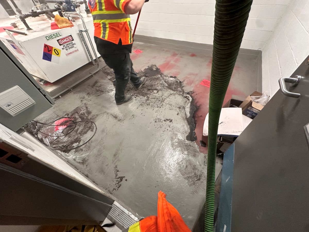 Once the bulk of the fuel had been safely evacuated via vacuum equipment, we shifted to detailed cleaning. Diesel can leave behind a slick residue that clings to equipment and continues releasing fumes long after the visible spill is gone. Our team cleaned every impacted surface to ensure it was completely restored.