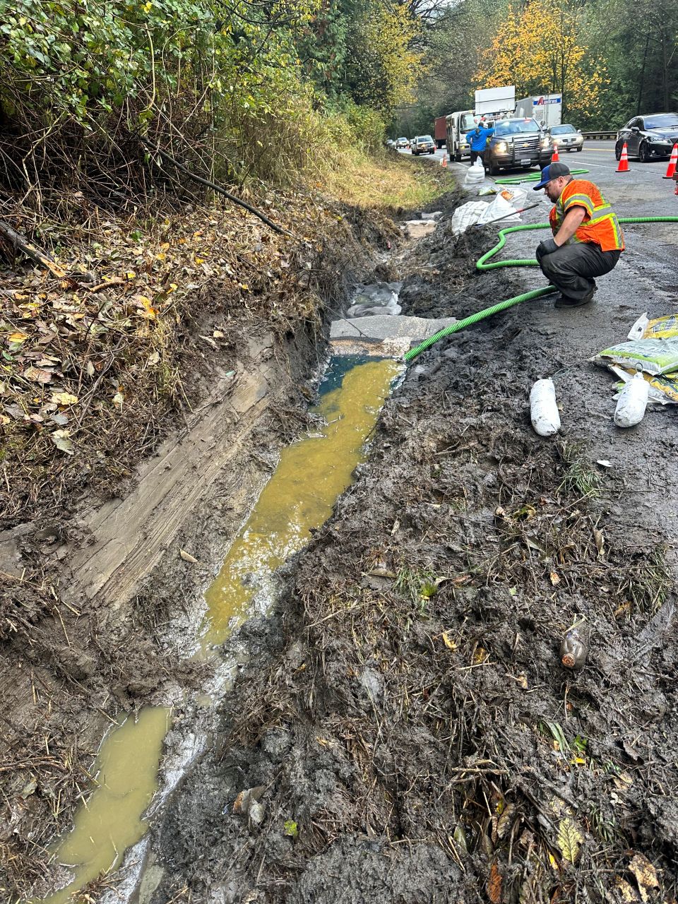 A semi-truck and trailer slid into the ditch off Highway 18 on Tiger Mountain between the Raging River Bridge and Tiger Mountain Summit. The fuel tank struck the asphalt hard, causing significant damage and a diesel spill. The semi-truck was stuck in the mud, and diesel was flooding the ditch, needing immediate cleanup and recovery.